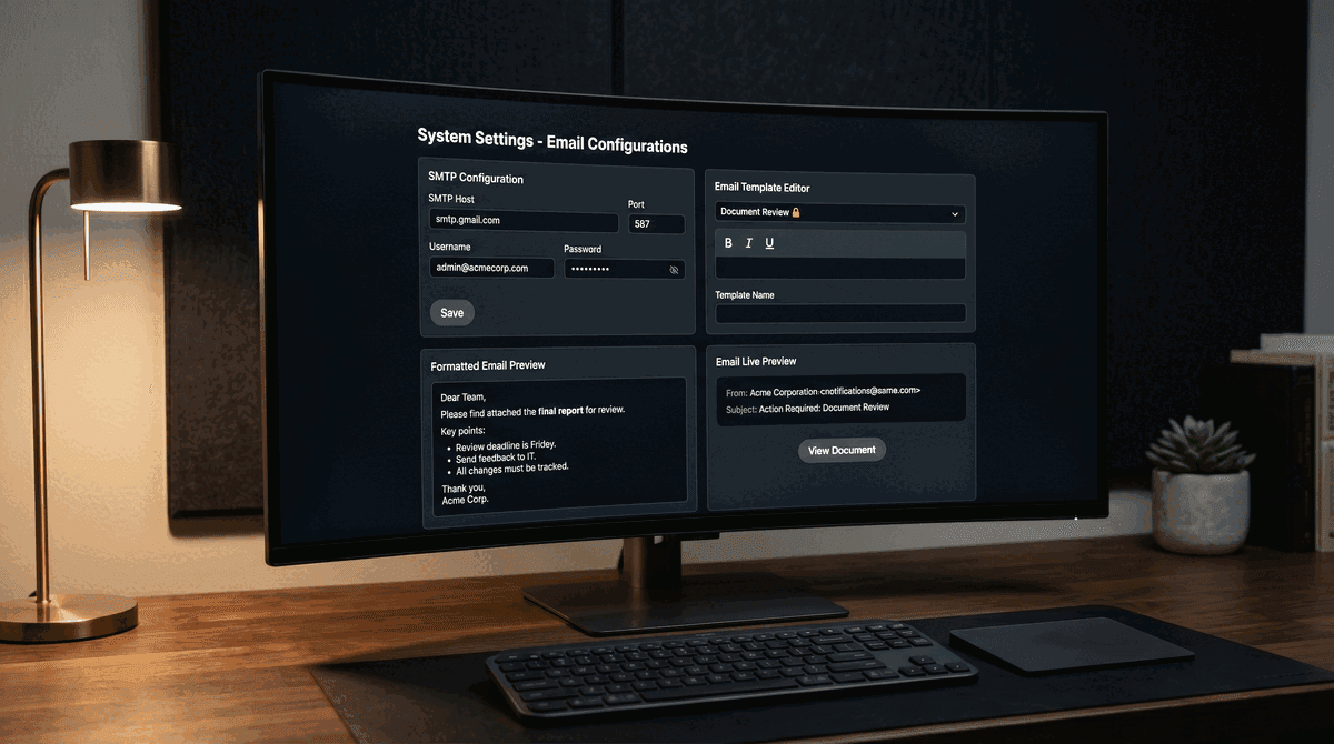 SMTP is the protocol that sends emails. You connect PaperLink to your email provider (Gmail, Outlook, or any SMTP server) so notifications go out from your address.